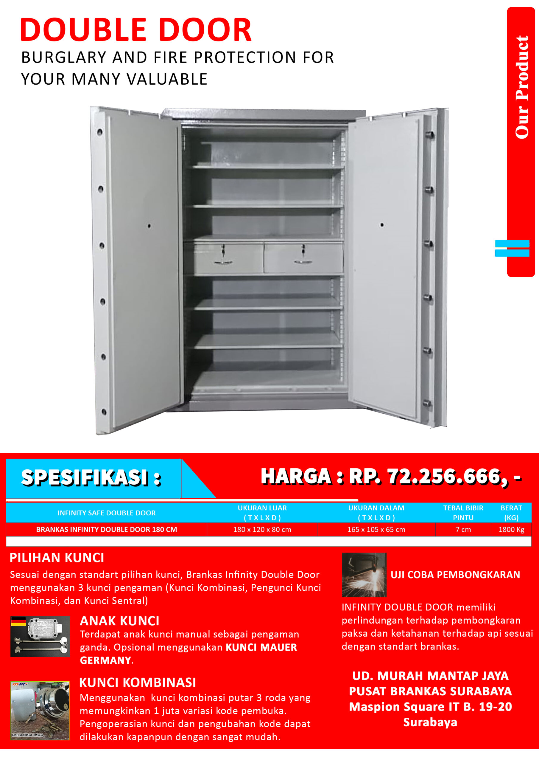 Brankas Infinity Double Door 2026 adalah Produk inovasi dari Brankas Infinity Safe yang menggunakan sistem 2 pintu. Brankas ini biasa digunakan untuk penyimpanan barang dengan sekala besar. Brankas Double Door Infinity menggunakan plat baja luar dan dalam yang dilas secara menyeluruh dan diisi dengan bahan material khusus sehingga membuat brankas ini tahan api dan tahan bongkar. Menggunakan 2 kunci kombinasi putar di kedua pintu brankas serta tambahan kunci sentral manual sebagai pengaman ganda membuat brankas ini memiliki keamanan yang ekstra. Brankas Double Door Infinity ini sangat cocok sekali digunakan sebagai kotak penyimpanan di Pegadaian, BPR dan lembaga keuangan lainnya.